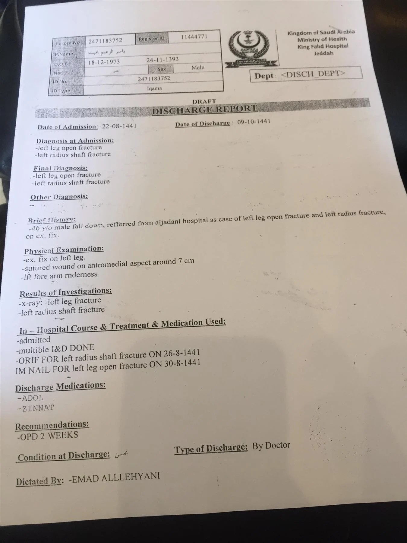 أمر المستشار حماده الصاوى النائب العام بفتح التحقيق في الشكوى المقدمة من الدكتور نبيل فزيع المحامي بصفته وكيلا عن المواطن المصرى ياسر الزعيم ،والذى أصيب إصابة بالغة أثناء عمله بالمملكة العربية السعودية .